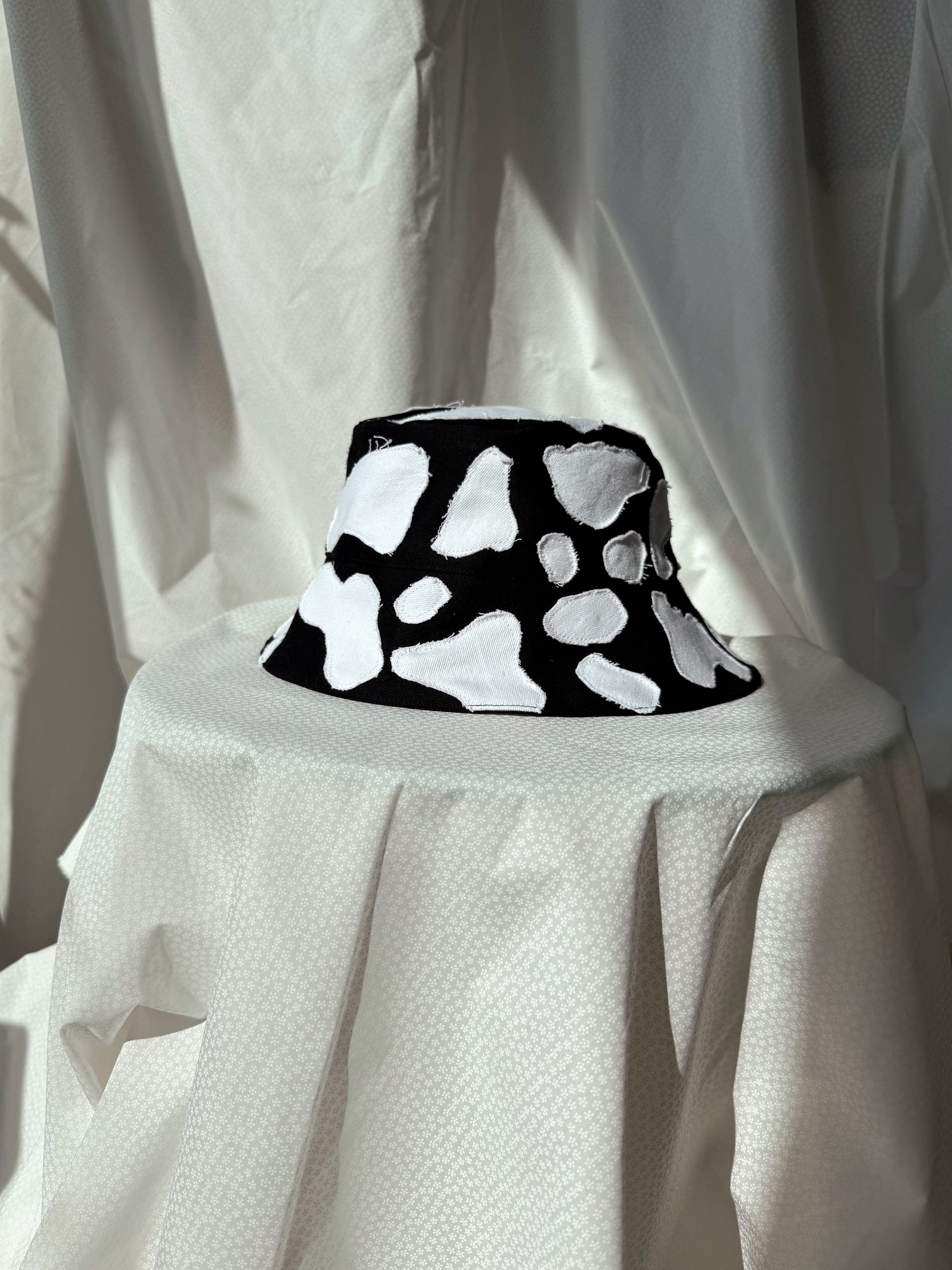 The result? A textured hat that playfully echoes cow print or dalmatian spots — bold, unexpected, and upcycled.